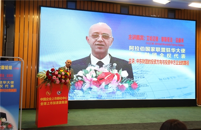 主讲嘉宾2阿拉伯22国家联盟驻华大使--艾哈迈德·穆斯塔法 · 法赫米(H.E.Mr.Ahmed Mustafa Fahmy Hafez)在论坛中介绍中阿企业的投资合作前景,好的项目会大力引荐中东财团积极投资,也欢迎中国企业到中东投资,共建一带一路中阿经济走廊!